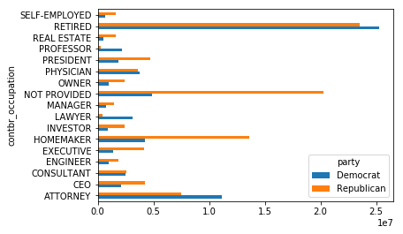 接下来,我们要统计两个候选人和投资人职业的关系。使用groupby技术,这里定义了一个函数用来将同一职业的捐赠金额排序、合并。最后找出了前7位职业。