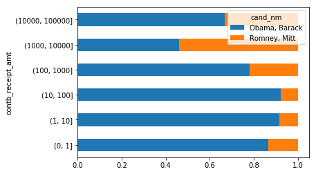 [(0, 1] < (1, 10] < (10, 100] < (100, 1000] < (1000, 10000] < (10000, 100000] < (100000, 1000000] < (1000000, 10000000]]grouped2 = fec_choose.groupby(["cand_nm",labels])