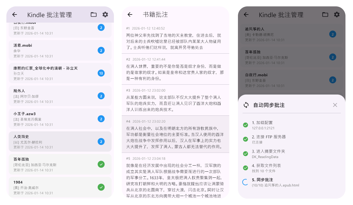 - 沉浸阅读 (Reading):在 Kindle 上享受纯粹的阅读体验,随手进行高亮和批注。