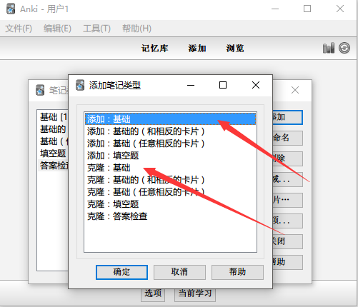 在主界面,单击*“工具”→“管理笔记类型”→“新建”*来创建一个名字为“答案检查”的笔记类型。类型选择“添加:基础”,也可以克隆原有的项目,选择“克隆:基础”即可。
