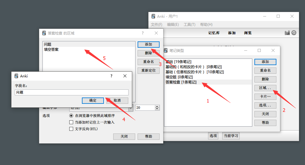 按照下图顺序,选择刚才我们新建的笔记类型“答案检查”,自定义其“区域”,删除原来的区域“正面”和“反面”,如图例3、4所示,新建两个命名为“问题”和“填空答案”的区域。