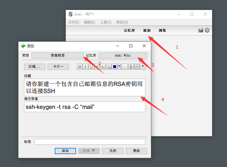 回到你想要添加到的记忆库的主界面,单击“添加”,选择类型为“答案检查”,填入问题和答案,点击“添加”。