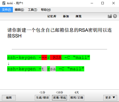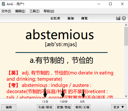 Anki对于我来说,不是一个检查自己记忆力好坏的软件,而是一个可以提高效率学习更多知识的软件,所以,请务必花一些时间去思考并填加一些自己的心得体会。这也是我认为为什么“编辑”按钮出现在这么关键位置的原因。