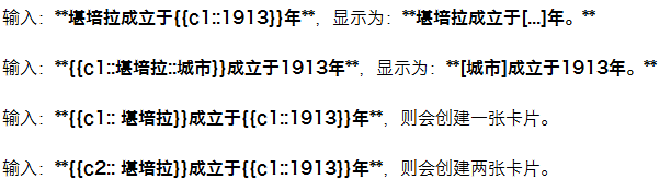[^1]: Anki将填空看作特殊的笔记类型,不能基于通常 的笔记类型创建。如果需要自定义,请确保原样复制已有的Cloze(填空)类型, 而不是使用其他笔记类型。 [^2]: Anki不支持嵌套填空。 [^3]: 填空笔记类型默认的第二条区域(字段)叫做Extra(额外信息), 会在 每张卡片的背面显示。 它可以用来添加一些有用的笔记或额外信息。