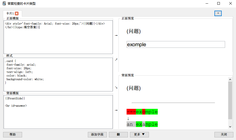 完成之后,关闭“区域”窗口,单击“答案检查”的“卡片...”按钮以更改“答案检查”的卡片类型。如下图所示,更改正面和反面模板,注意正面需要有问题以及答案的输入框,背面可以不需要显示答案,但一定要有FrontSide字段来显示正面的信息。这里我把样式也改了下,左对齐。