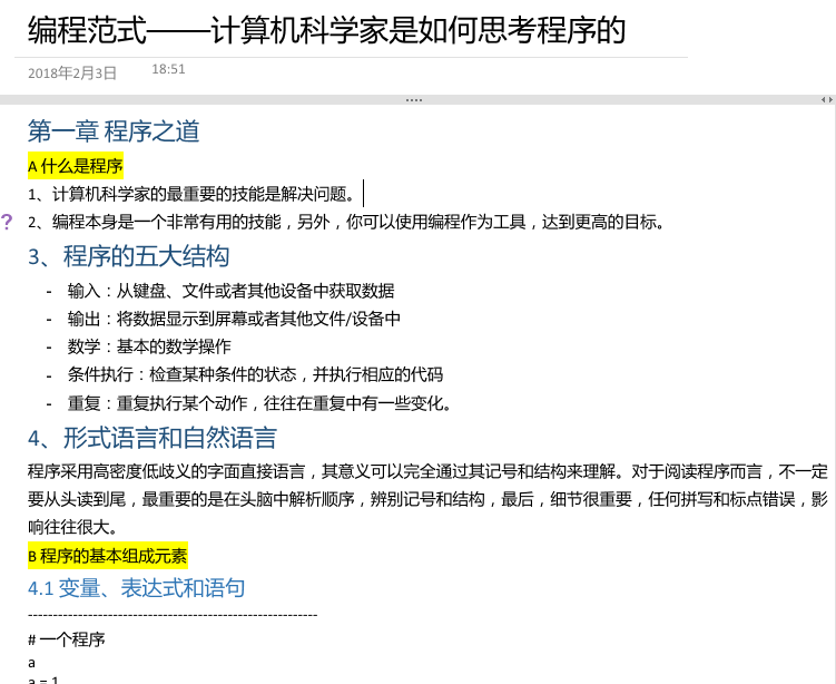 有人说,按照书本/老师自己的结构来不行吗?为什么我们要有自己的结构呢?对于这个问题的回答,我认为,这是因为知行目的不同。知是知识,知识不论采用什么架构无所谓,但是行,则需要一个流程性的东西,而这些知识,在我的框架中是要应用的,而白纸,就代表了知识在我脑袋里的流程,这种结构很重要,并且是人人不同的,其根据我们利用知识的目的不同,结构也不相同,比如我在重读《Think Python》一书的时候,发现作者的章节编排都是按照Python语言的实现顺序来写的,首先是结构、其次是表达式和for循环,for循环是实现切片的基础、由此引出来了建立在其上的函数们。而我的学习目的是为了使用,我大体是按照这个流程,不过还加上了如何建立这个数据结构?这个数据结构和其他结构如何转化?这个数据结构有什么使用上的须知?这些东西显然是需要我们按照一个自己的结构来走的。
