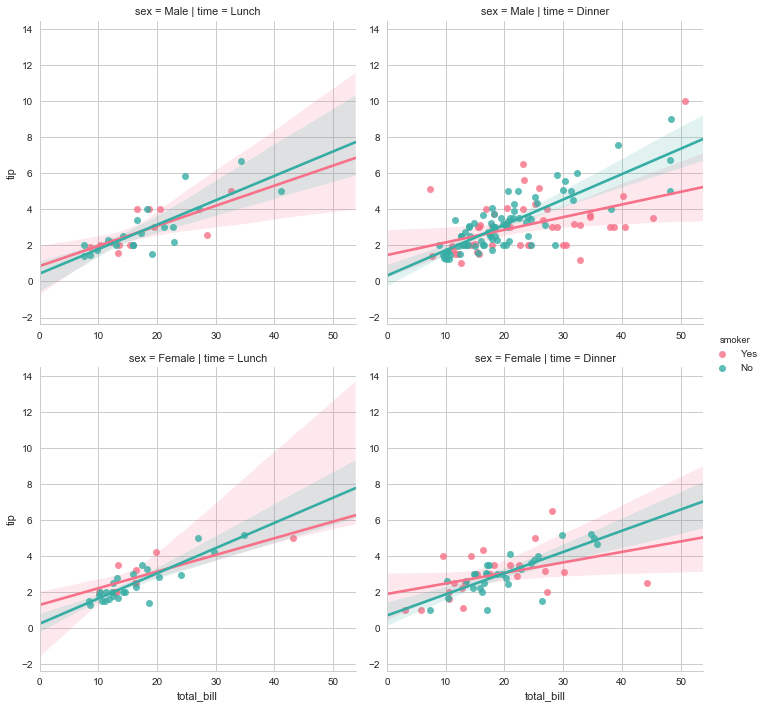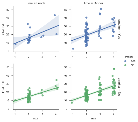 g = sns.FacetGrid(tips,col="time",row="smoker",hue="smoker",margin_titles=True)