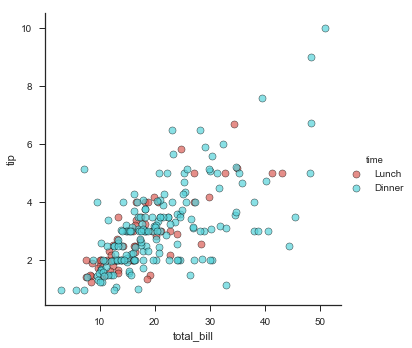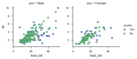 g.map(plt.scatter, "total_bill", "tip", s=50, alpha=.7,