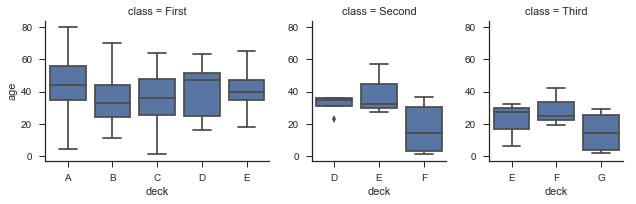 g = sns.FacetGrid(titanic, col="class", sharex=False,
