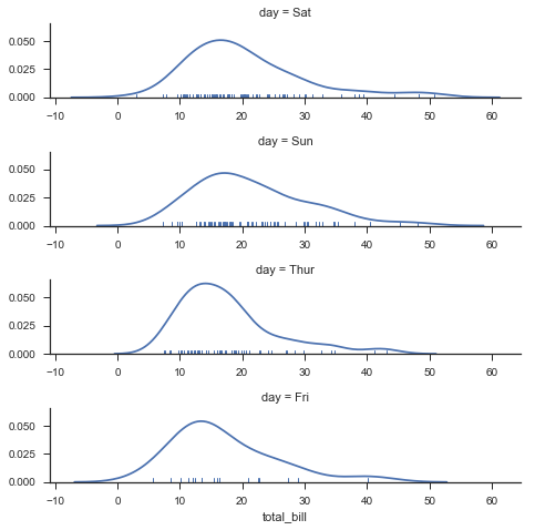 g.map(sns.distplot, "total_bill", hist=False, rug=True);
