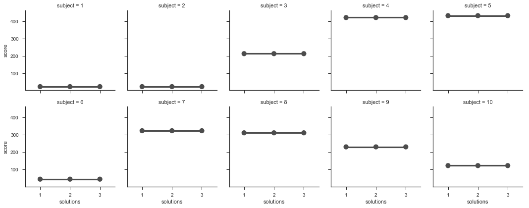 g.map(sns.pointplot, "solutions", "score", color=".3", ci=None);