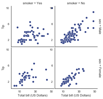 g.set_axis_labels("Total bill (US Dollars)", "Tip");