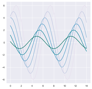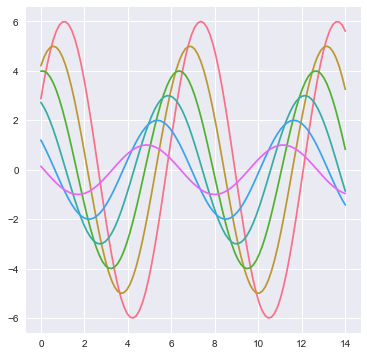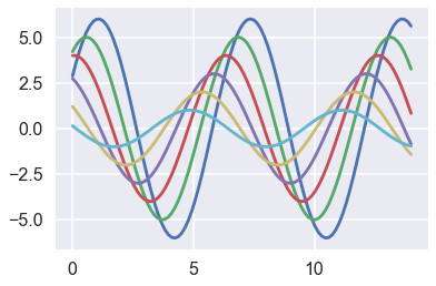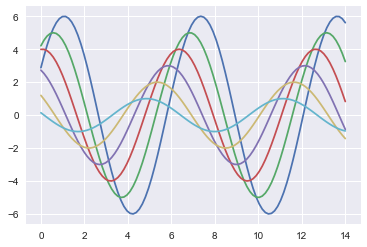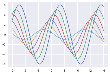 plt.plot(x, np.sin(x + i * .5) * (7 - i) * flip)