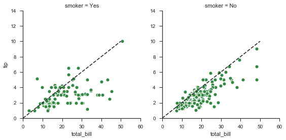 g.map(plt.scatter, "total_bill", "tip", color="#338844",