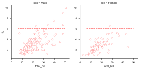 g.map(myplot, "total_bill","tip",color="w",edgecolor="r");