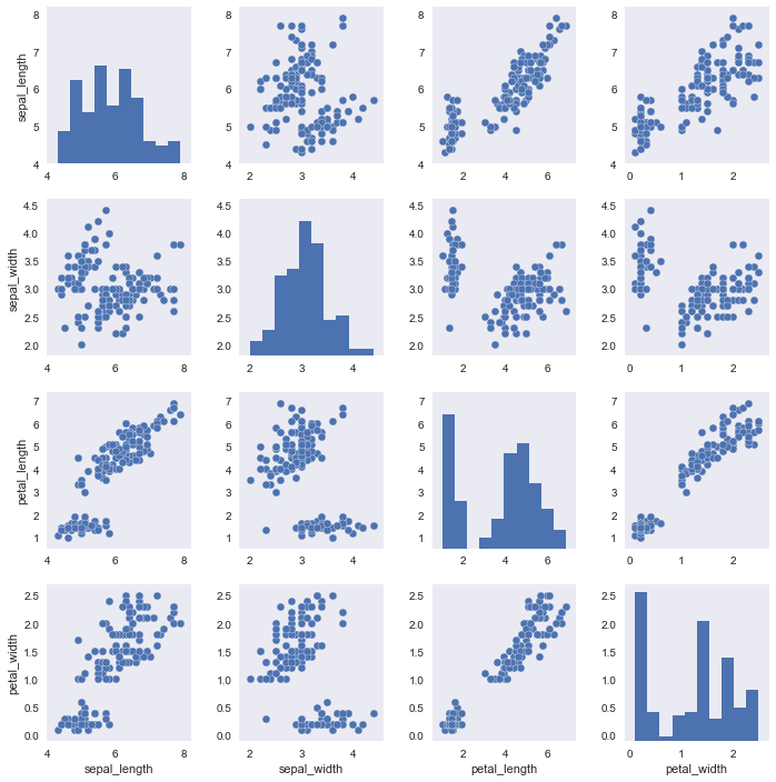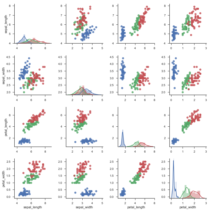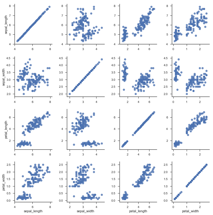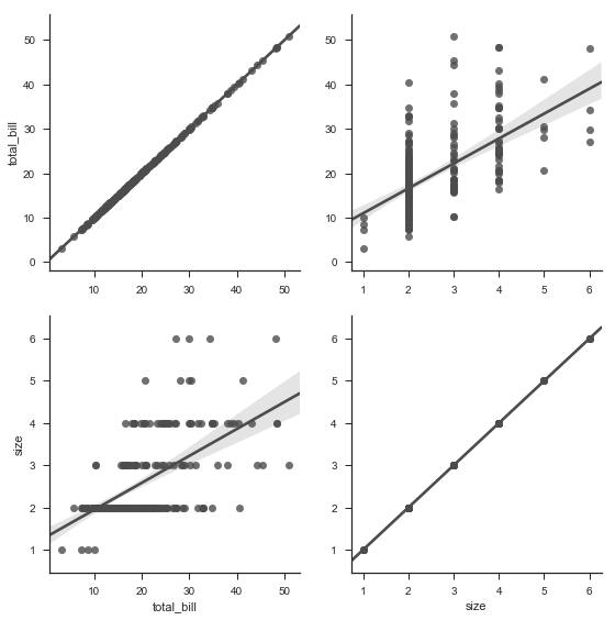 和FacetGrid相似但又不同的是,PairGrid的每个子图形包含不同的关系,而FG则包含相同的关系(只不过是不同级别的)。此外,它们都采用类似的方式工作,比如先定义对象,然后使用map进行子图绘制。