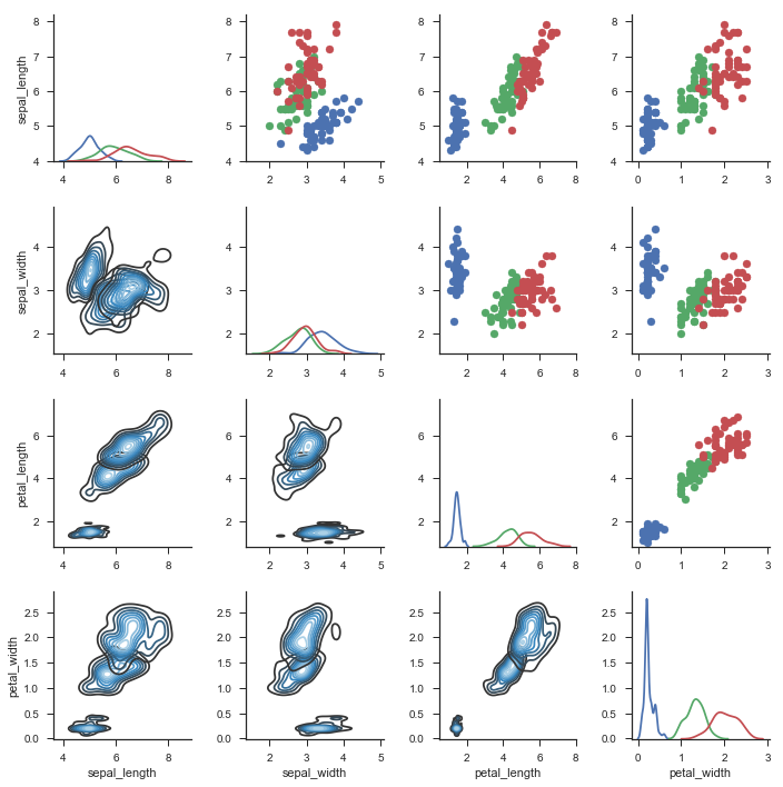 g.map_lower(sns.kdeplot, cmap="Blues_d")