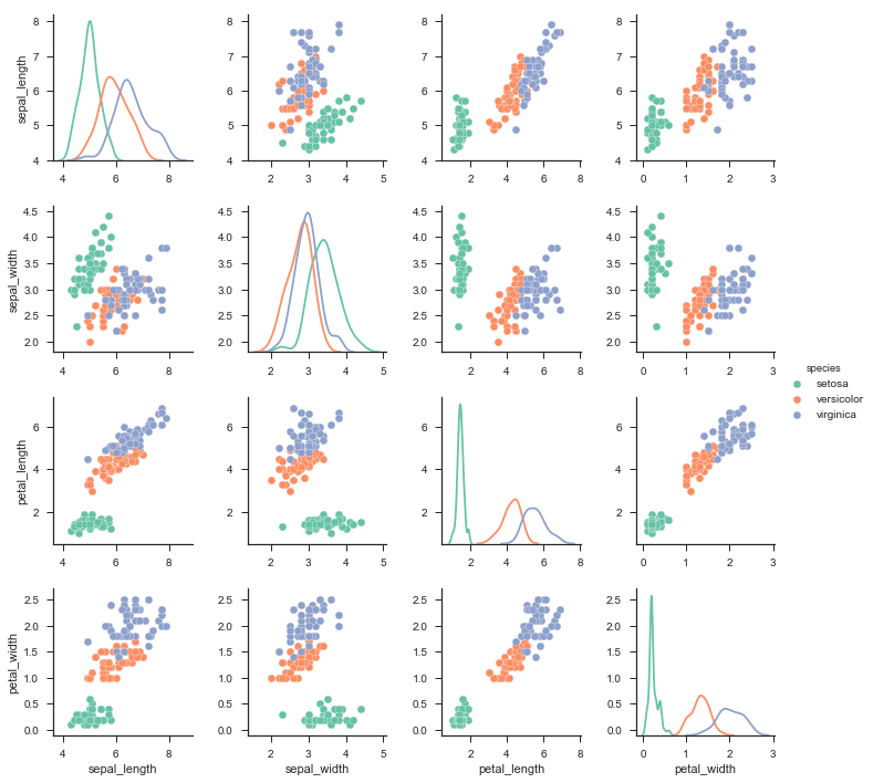 g = sns.pairplot(iris, hue="species", palette="Set2", diag_kind="kde", size=2.5)