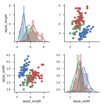 g = sns.PairGrid(iris, vars=["sepal_length","sepal_width"], hue="species")