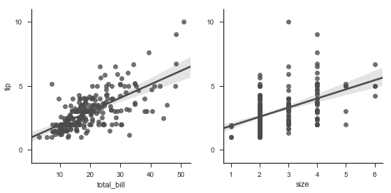 g = sns.PairGrid(tips, y_vars=["tip"], x_vars=["total_bill", "size"], size=4)