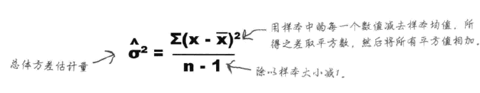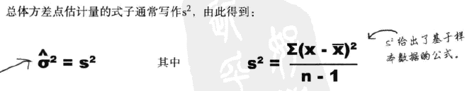 同样的,我们有总体方差(σ^2)、总体方差的点估计((σ^)^2)、样本方差(s^2)三个变量。需要注意,样本方差计算时取n,但是样本方差作为总体方差的估计量的时候计算时取n-1。