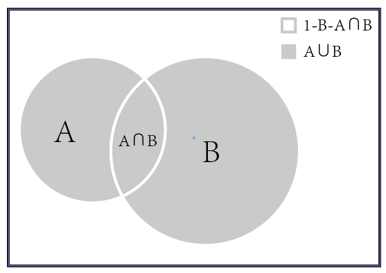如上图所示,可以很方便的表示出A、B、A+B、A'、A∩B、A∪B的概率。对于没有交集的概率来说,称其为独立事件,对于有交集的概率来说,则表示其共同发生的概率。