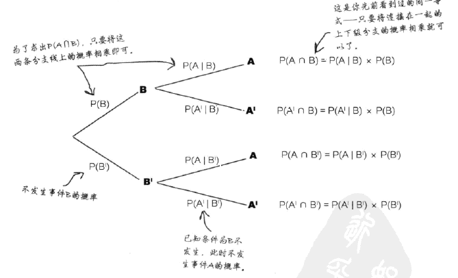 每个第二分支的概率都等于条件概率,其计算方法就是其标准定义——在VNN图很方便的可以描述—— P(A:B) = P(A∩B)/P(B)。在概率树上也很方便——只需要将第一个分支和第二个分支相乘即可。