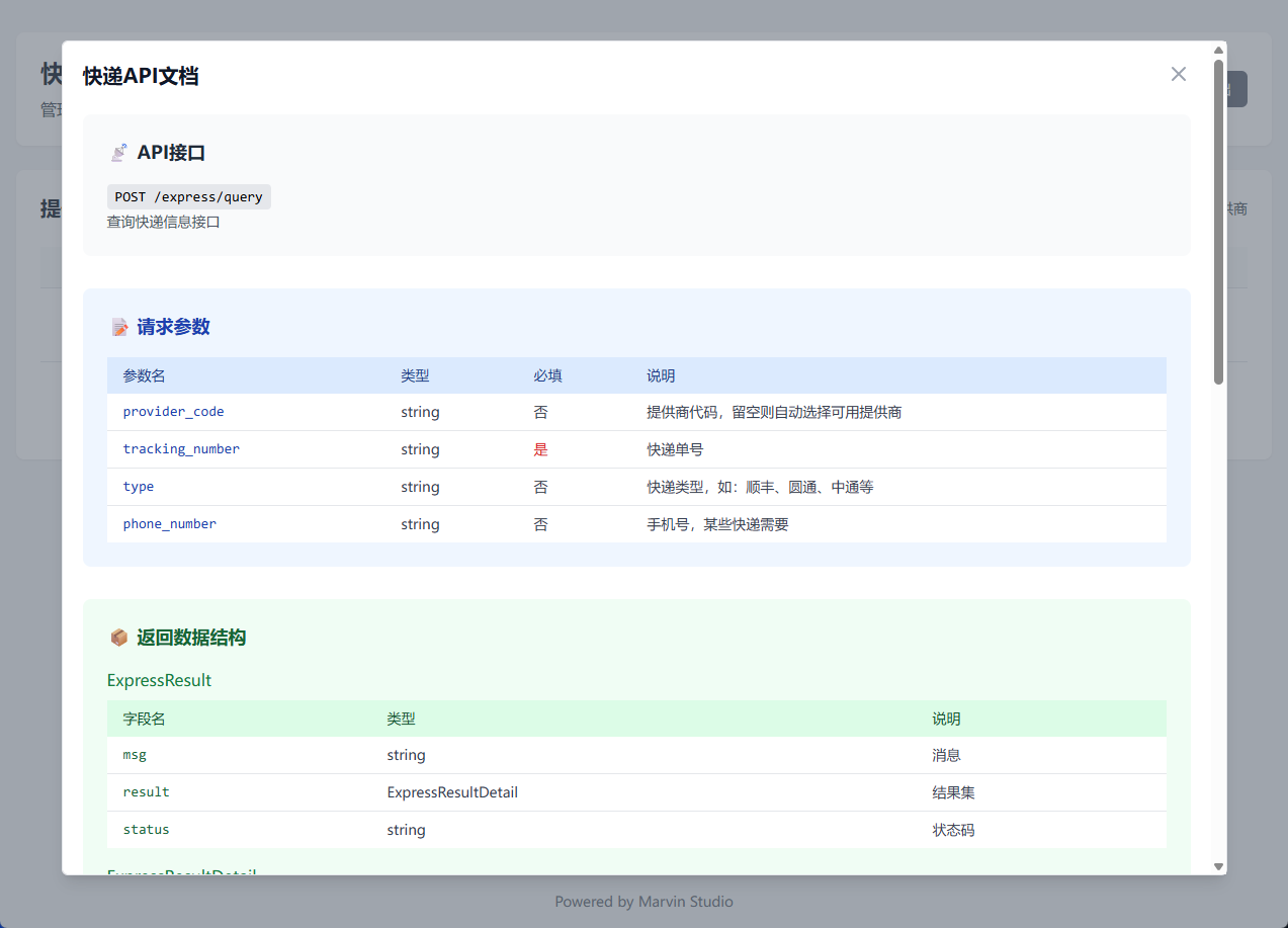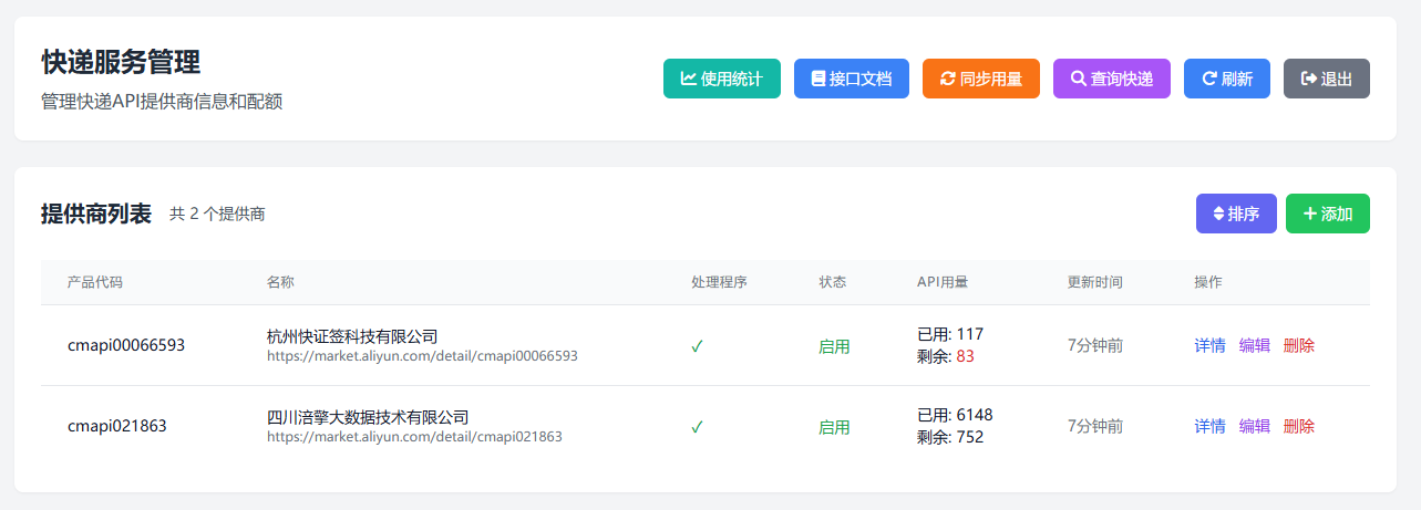 便捷的后台管理与测试:系统提供了一个功能完善的管理后台。用户不仅可以管理服务商,还能直接在界面上输入快递单号进行测试,快速验证某个服务商的可用性,极大地方便了日常运维与故障排查。