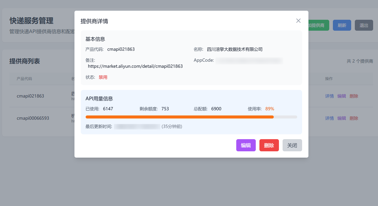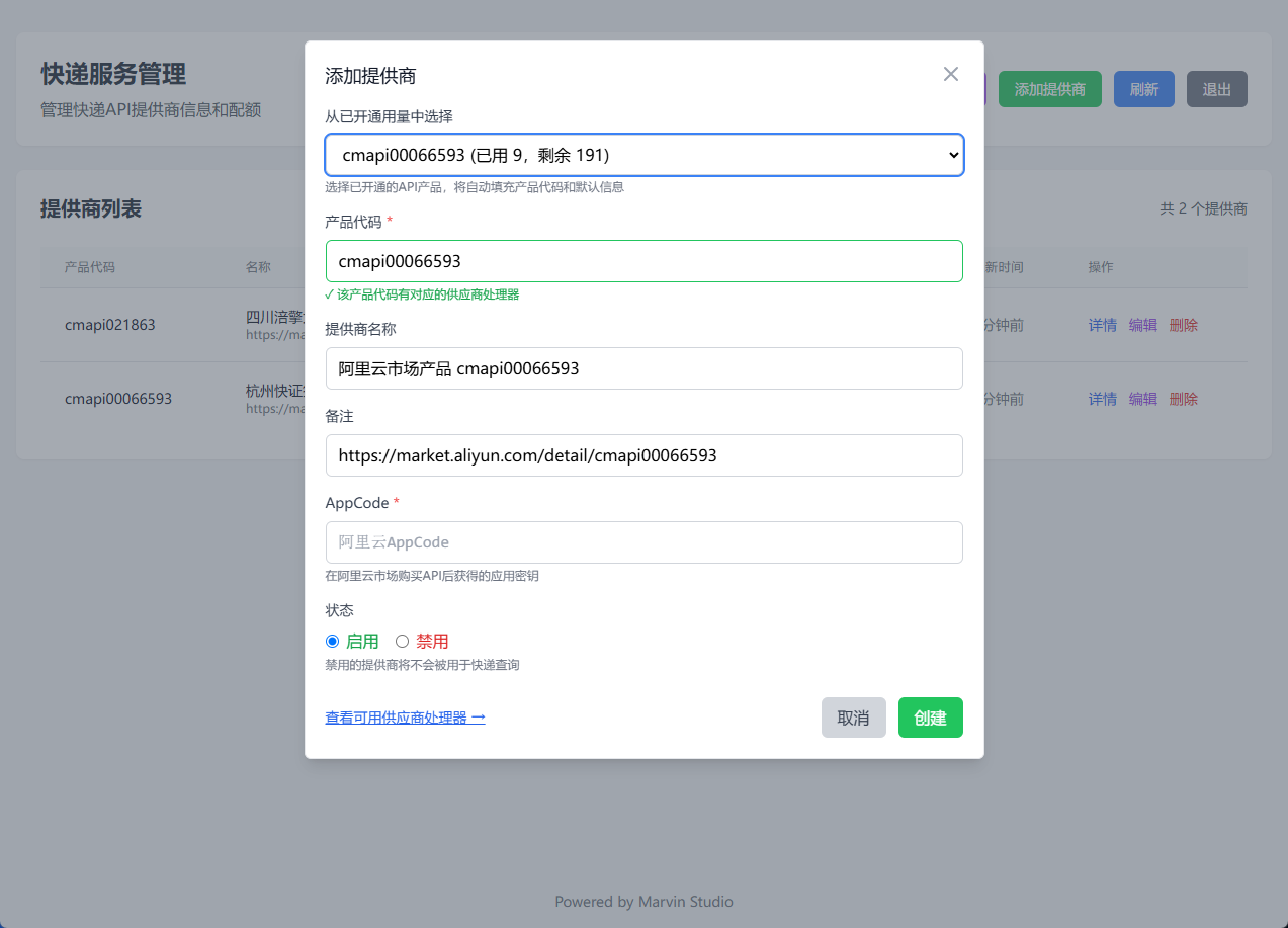 统一的服务商管理:系统支持对阿里云市场的不同快递服务商进行统一的增、删、改、查。用户可以将已购买的服务商 API 及其 AppCode 录入系统,并随时启用或禁用。