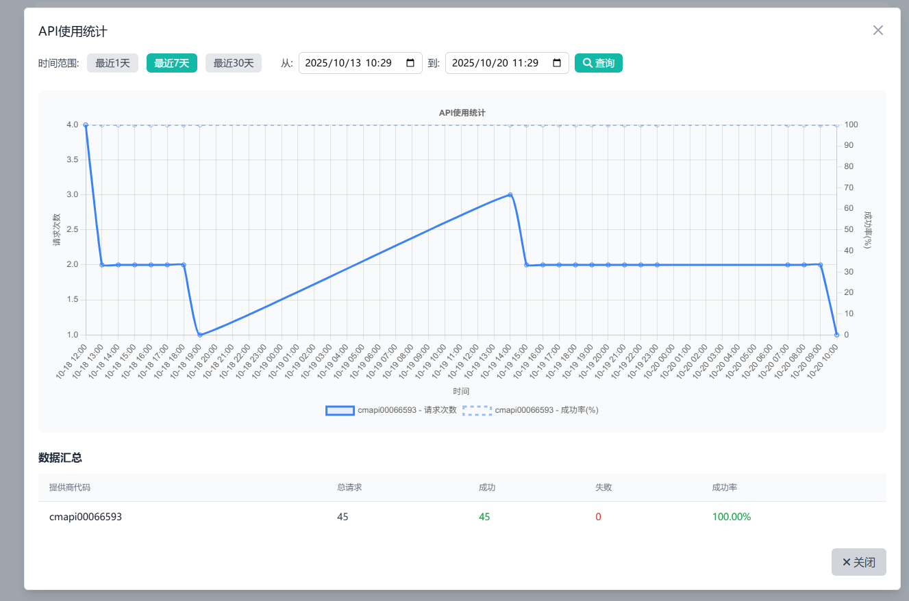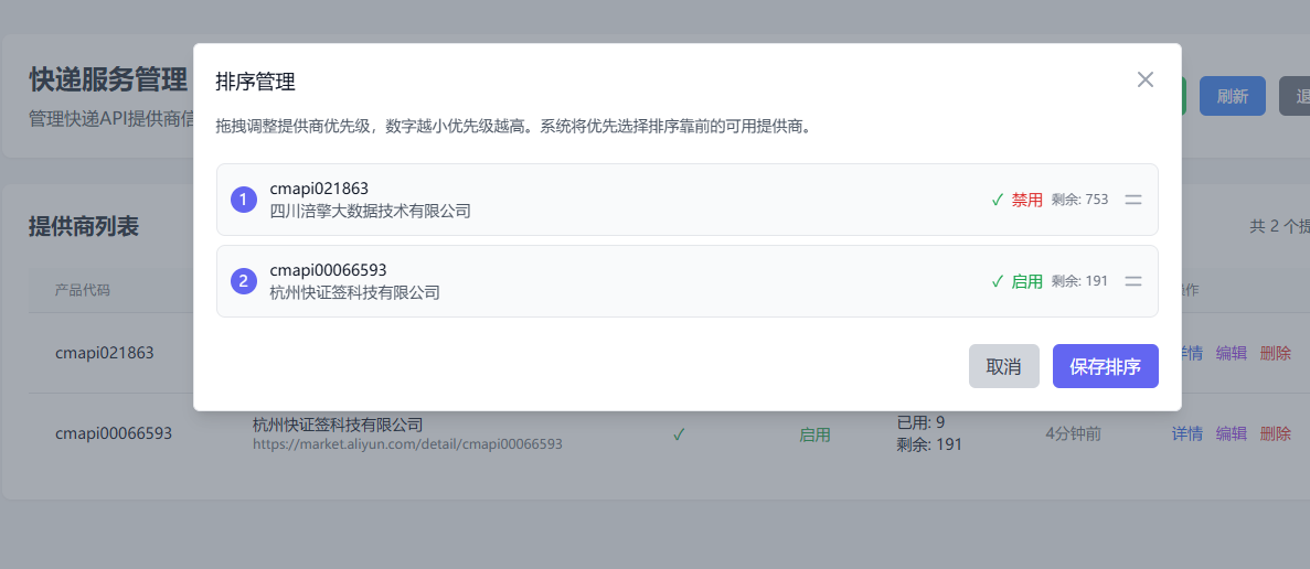 系统管理员在后台巡检时,发现排名第一的服务商 API 用量已达到 95%,即将耗尽。他立即在该服务商的详情页将其状态修改为“禁用”。系统将自动顺延使用排名第二的服务商。整个切换过程对前端用户和业务系统完全透明,有效避免了因配额用尽导致的服务中断。